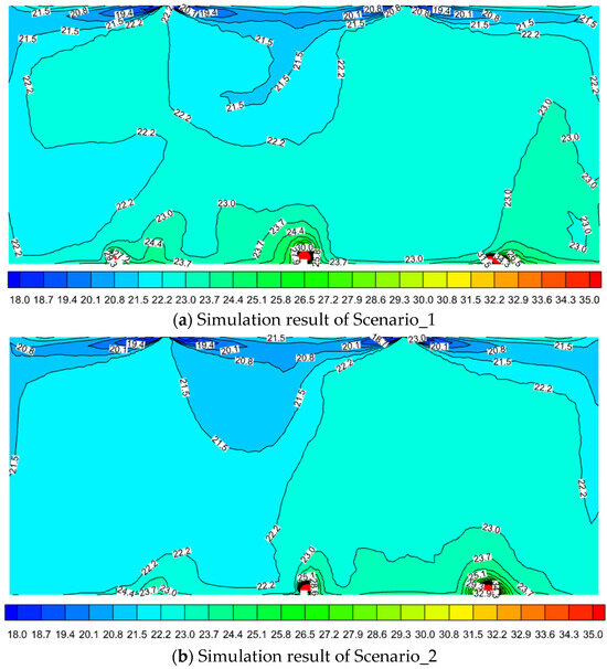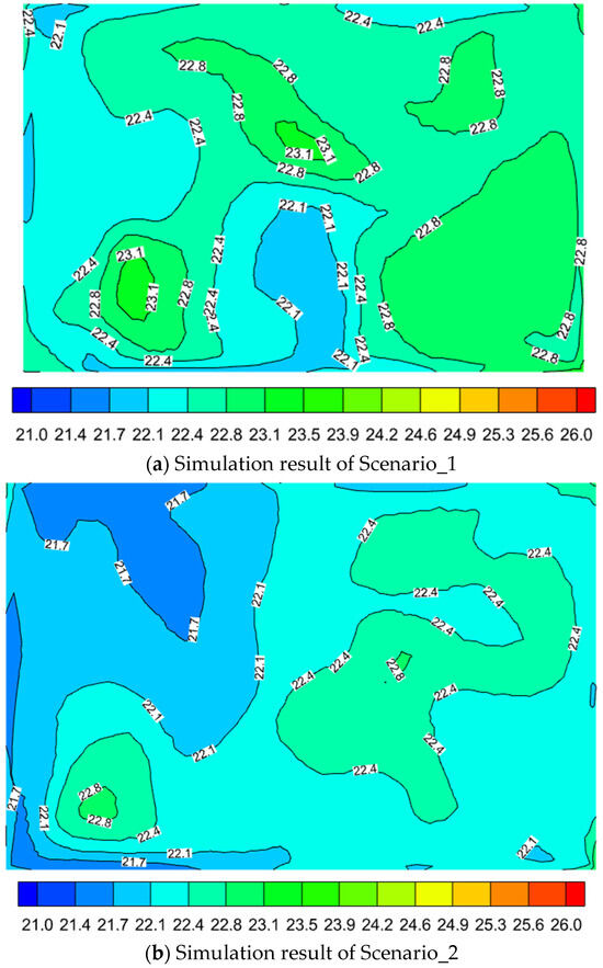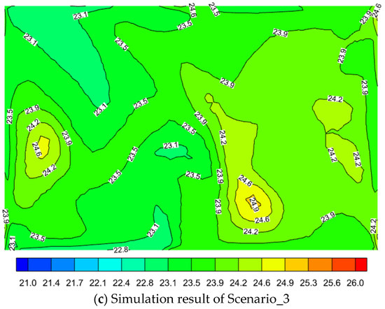 The simulation results of the three experimental scenarios are shown in Table 8. The internal loads of Scenario 1 and Scenario 2 were the same, but the air supply volume of Scenario 2 was slightly larger than that of Scenario 1. Based on the principle of energy conservation, the indoor average temperature and the temperature at the height of 1.2 m working surface of Scenario 2 were slightly lower than that of Scenario 1. Scenario 2 and Scenario 3 had the same amount of air supply, but the internal load of Scenario 3 was larger than that of Scenario 2, so the average indoor temperature and the temperature at the height of 1.2 m working surface of Scenario 3 were higher than that of Scenario 2.