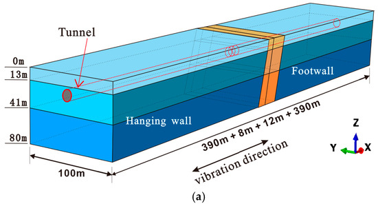 It is generally believed that the level of seismic damage to underground structures such as tunnels may be lower due to certain constraints of the surrounding rock. However, the level of seismic damage to underground structures such as tunnels may be more serious when they are near or cross the seismic fault [1,2,3]. The fault fracture zone directly affects the safety of the tunnel due to the poor surrounding rock conditions and insufficient self-stability. Seismicity is closely related to the distribution and activity of faults. Consequently, when the tunnel is near or crosses the seismic fault, the coupling effect of seismic action and strata change caused by fault activity can make the seismic damage mechanism to the tunnel more complicated.