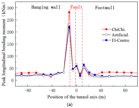 Taking the Chi-Chi wave as an example, the distribution characteristics of peak soil pressure along the tunnel axis were analyzed. As shown in Figure 12a,b, the curves of the vault and arch bottom of the tunnel located in the hanging wall and footwall sections are relatively straight, and the range of peak soil pressure is about 0.19 to 0.35 MPa. However, under the influence of the fault, the peak soil pressure of the tunnel located at slip surfaces increases significantly. The peak soil pressure at the first slip surface is most significant, and the most significant soil pressures of the vault and arch bottom at the first slip surface are 1.88 MPa and 1.46 MPa, respectively, which are much higher than the soil pressure in the hanging wall and footwall sections of the tunnel. The reason for this result is that soil activity near the fault is more intense under seismic action, and the soil dislocation caused by seismic action on the slip surfaces will directly act on the tunnel structure, resulting in the dynamic soil pressure of the tunnel at the slip surfaces being much larger than that at other locations.