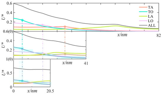 - As the thin film size decreases, the energy density inside the thin film gradually increases. When the film tangential size is 82 nm, the total phonon energy density is dominated by acoustic modes. When the thin film thickness is 20.5 nm, the total energy density is significantly influenced by optical modes. This means that as the film size decreases, the influence of the optical phonon branch gradually increases.
