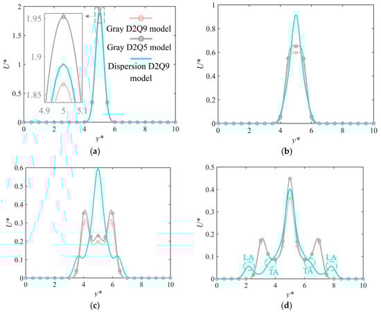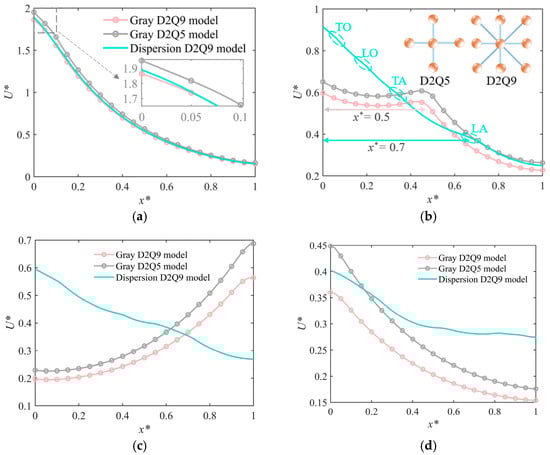 - When more attention is paid to the characteristics of energy in the transmission process, the dispersive model is preferred. If only the initial and equilibrium states of energy transfer are taken into account, the gray model is also a good choice. Compared to the D2Q5 lattice, the increase in computational cost of the D2Q9 lattice is small, but faster transmission efficiency can be achieved. Consequently, the D2Q9 lattice is a superior choice.