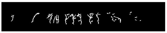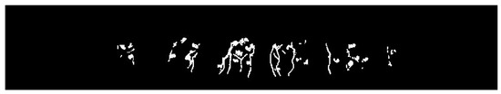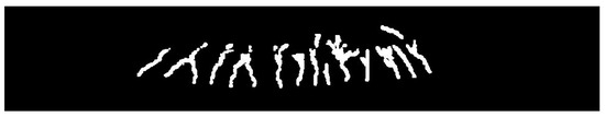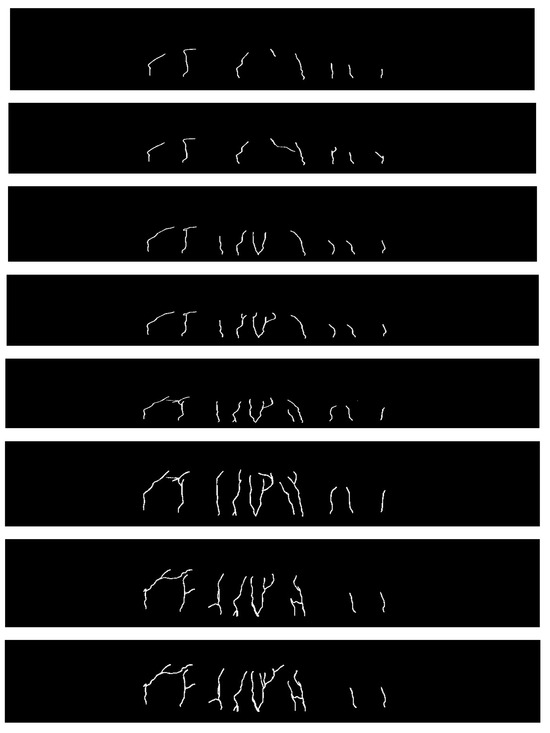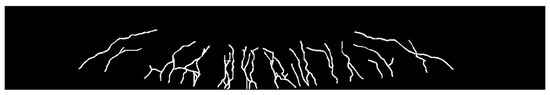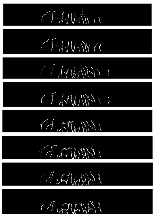 The image processing techniques of KNN and SVM play a pivotal role in this study. Initially, specific images are identified, and as the loading process ensues, the developed cracks are highlighted in red. To facilitate categorization and assessment, the beams are classified into 16 categories based on their failure types and performance criteria. Throughout the loading process (e.g., Figure 4), sixteen images are captured from each beam and input into the image processing tool in MATLAB software version 2019a. Figure 5 illustrates the processing of the image cracks while taking into account their growth. These models use the detected cracks to classify the beams into their respective categories. Subsequently, one image is selected from each folder, and the program automatically processes all the images within the folder. It is important to note that the time it takes for the program to read certain folders varies based on the image size and the number of cracks present. As the program sequentially processes all the images, it classifies them based on the detected cracks from the beginning to the end of the loading process.
