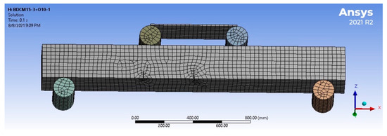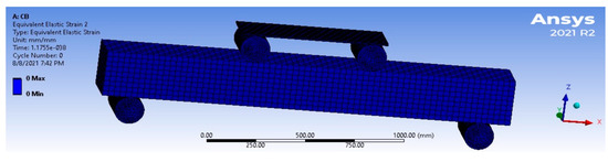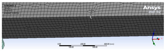 To enhance the conceptual understanding, Figure 16 provides a numerical schematic representation of the BDCO (15-3) beam. This visualization serves as a valuable tool for unraveling the structural intricacies and design features, offering insights into the factors influencing the beam response to the loading conditions. The amalgamation of compliance analysis, crack propagation observation, and image processing methodologies has unveiled a nuanced understanding of the structural behavior of the examined specimens. The consistent compliance with the BDCM and SBDRA, coupled with the unique insights derived from the FRP reinforcement and failure patterns, contributes to a comprehensive understanding of the structural dynamics and will inform future considerations about design and analysis.