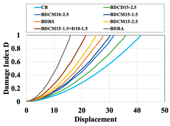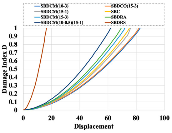 Figure 30 and Figure 31 depict the failure index plotted for all the samples. In this context, a lower ascending slope indicates that the beam is less damaged and exhibits greater deflection tolerance, resulting in a lower failure index. Consequently, the CB and SBDCM (10-3) specimens display the lowest failure index graph slope, while the BDRA and SBDRS specimens exhibit the highest failure index graph slope, signifying the most severe form of failure among the existing failure modes. Furthermore, the failure index slope varies across the other specimens featuring distinct types and sizes of failure.