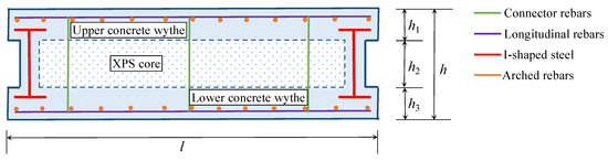 In order to improve the bearing capacity of concrete sandwich panel structures, this paper proposes to install arch steel–concrete composite beam restraint members at the end of a reinforced concrete sandwich roof to improve the bending and shear-bearing capacity of the sandwich panel and enhance the out-of-plane stability of the inner and outer wythes of the roof structure. The steel–concrete composite beam is installed at the foot of the arch roof to improve the supporting capacity of the roof and reduce the requirement of the arch foot support arrangement of the arch roof. Figure 1 shows the diagram of the cross-section of the steel–concrete sandwich roof. The steel–concrete composite sandwich roof (with length l and thickness h) is composed of upper and lower concrete wythes (with thicknesses h1 and h2, respectively), an XPS core layer (with thickness h3), steel arch beams, and connector rebars. The connector rebars coordinate the interaction between the concrete upper and lower wythes, resulting in a high bending and axial load-bearing capacity. The steel arch beams provide edge restraint for the roof, giving it high overall integrity. The XPS core layer improves the thermal insulation performance of the roof.