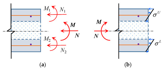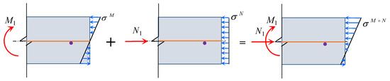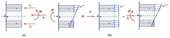 When the action mode of the concrete sandwich panel structure is simplified, the bearing capacity of the soft sandwich insulation layer is usually ignored, and it is considered that the shear force of the section of the sandwich panel is mainly borne by the connectors. According to the characteristics of the fully combined action behavior of the inner and outer leaves of the concrete sandwich panel, Figure 3 shows the fully combined stress mode of the concrete sandwich panel under axial compression and bending internal force. The distribution of N1 and N2 in the figure is the internal force shared by the upper and lower concrete wythes under the action of bending internal force, and σM, σN, and σM+N are the stress distribution of the concrete wythe under bending moment, axial force, and compression–bending internal force, respectively.