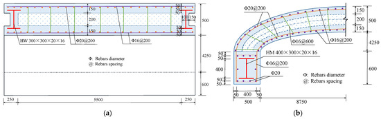 To emphasize the spatial shape of the steel–concrete composite sandwich panel structure and demonstrate the structural behavior, the finite element model focuses on an elliptical arch roof with a span of 18 m. The roof has a height of 4.5 m and a rise–span ratio of 0.25. The arch roof structure is constructed by assembly construction mode, and the segment length of the roof is 6 m. The thickness of the concrete sandwich panel is 500 mm, and steel mesh is placed in both the upper and lower concrete wythes. Connector rebars are additionally incorporated between the wythes to enhance their combined strength. In addition, steel–concrete edge restrained arch beams are arranged at the ends of the concrete sandwich panel arch roof segment, and longitudinally arched steel–concrete supporting beams are arranged at the arch foot of the arch roof. The steel arch beam is extended into the supporting beam to form a stiffening joint area, which ensure the reliable connection between the steel arch beam and the supporting steel beam. Figure 6 shows the dimensional details of the elevation and sectional construction of the elliptical arch steel–concrete composite sandwich roof. The reinforcing bars used in the model specimens are all of HRB335 grade, while the I-beams are made of Q235 grade steel.