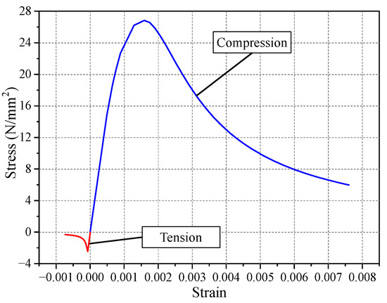 The upper and lower wythes, as well as the supporting beams, of the arched steel–concrete composite sandwich roof structure are made of concrete with a strength grade of C40. The elastic modulus (Ec) is 3.25 × 104 N/mm2, the standard compressive strength value (fck) is 26.8 N/mm2, the standard tensile strength value (ftk) is 2.39 N/mm2, and the Poisson’s ratio (v) is 0.2. Taking into account the cracking and crushing of concrete, the shear transfer coefficients are taken as 0.95 and 0.5 for concrete crack closure and opening, respectively. The unit weight (Gc) is 2.4 × 10−5 N/mm3. The cracking behavior and non-linear mechanical behavior of the concrete material are simulated using the crack dispersion model. The stress–strain relationship for the uniaxial tensile and compressive stress of the concrete should satisfy Equation (1), and the stress–strain curve of the concrete is given in Figure 7.