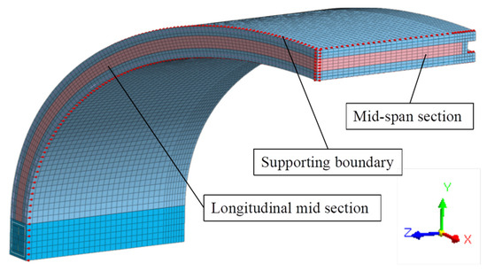 In order to improve computational efficiency and reduce calculation errors, a quarter model of the arched sandwich roof was established for simulation analysis. The boundary constraints at the cross-section at the mid-span of the roof and the longitudinal mid-section need to be set according to the loading conditions of the finite element model. According to the load arrangement in Section 3.2, for the working condition of uniformly distributed symmetric load over the entire span, constraints are implemented at the mid-span section of the roof to limit horizontal displacement and rotation of the section. Figure 8 shows the finite element model of the arched steel–concrete sandwich roof.