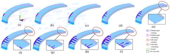 Concrete cracking of arch steel–concrete composite sandwich roof; (a) q = 7.5 kN/m2; (b) q = 8.0 kN/m2; (c) q = 9.0 kN/m2; (d) q = 10.0 kN/m2; (e) q = 11.0 kN/m2; (f) q = 12.0 kN/m2; (g) q = 13.0 kN/m2; (h) q = 14.0 kN/m2; (i) q = 15.0 kN/m2.