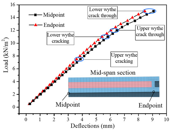 In view of the convergence error requirements of the finite element model calculations, the calculation of the load-bearing capacity of the arch-shaped concrete sandwich roof in this study did not involve concrete crushing and steel reinforcement yielding. Therefore, the load–displacement curve only reflects the cracking through the upper and lower concrete wythes in Section 4.1. It is pointed out in Section 4.1 that the cracking through the upper concrete wythe at the l/16 section of the roof and the cracking of the lower concrete wythe at the l/2 section have a good correspondence with the characteristic points of the load–displacement curve in Section 4.2. Similar research conclusions have been reported in Hamed [30].