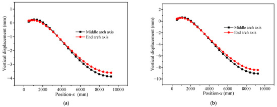 Vertical displacement of arch axis; (a) q = 7.5 kN/m2; (b) q = 15.0 kN/m2.