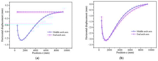 Horizontal displacement of arch axis; (a) qcr = 7.5 kN/m2; (b) qu = 15.0 kN/m2.