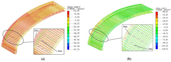The upper and lower concrete wythes of the arch-shaped steel–concrete sandwich roof are arrangements with both load-bearing and structural steel bars. After the concrete cracking occurs in the roof, the steel bar plays a key role in enhancing the load-bearing capacity of the roof. Figure 13 illustrates the distribution of axial stress in the steel bar skeleton of the arch-shaped sandwich roof under cracking and ultimate loads.