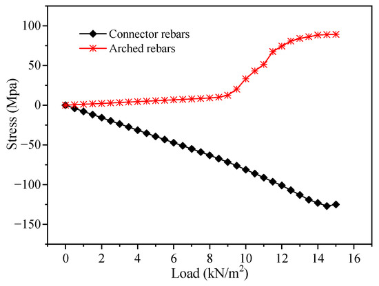 The analysis of Figure 13 reveals that under the action of cracking loads, the overall stress level of the steel reinforcement in the arch-shaped roof is relatively low. Only a few connectors in the vicinity of the x = 1.15 m section near the foot of the arch experience higher compressive stress. When the roof load increases to the ultimate load, the stress level of the steel reinforcement in the upper and lower concrete wythes of the arch-shaped steel–concrete sandwich roof remains relatively low. However, there is a significant localized increase in stress near the l/16 section from the foot of the arch. At the upper wythe in the roof’s end section, the reinforcing bars experience peak tension stress, with σmax = 89.24 MPa. Conversely, the tension bars at this section exhibit peak compressive stress, with σmin = −125.03 MPa. Figure 14 presents the stress variations of the steel reinforcement elements with the increase in load.