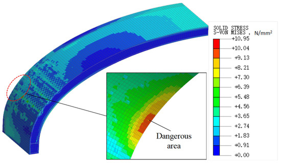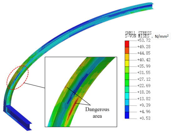 By introducing a steel–concrete composite section at the end of the arch-shaped roof, the axial and flexural stiffnesses of the roof are improved, effectively enhancing the vertical load-bearing performance of the arch-shaped roof. According to the analysis of concrete cracking in the arch-shaped roof, it can be observed that the end of the steel–concrete composite sandwich roof is the first region to crack, and the embedded I-section steel plate in this area plays a crucial role in the structural load-bearing performance stability. Figure 15 presents the distribution of von Mises stress in the I-section steel skeleton of the sandwich roof under the ultimate load of 15 kN/m2.