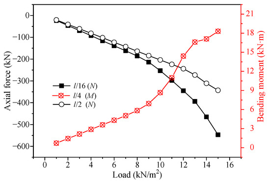 In addition, the internal forces for the different typical cross-sections generally exhibit a linear increase with the increase in load levels. However, the axial forces for the l/16 section, bending moments for the l/4 section, and axial forces for the l/2 section show different patterns. Figure 17 illustrates the variations of the axial forces for the l/16 and l/2 sections and bending moments for the l/4 section under different load levels. Analyzing Figure 17 reveals that when the load level is below the cracking load, the internal forces for all sections show a linear increase. However, when the load level reaches the ultimate load, the axial force for the l/16 and l/2 sections increases by 57.7% and 11.8% compared to the linear increase, and the bending moment for the l/4 section increases by 69.4% compared to the linear increase. This analysis indicates that as the cracking damage in the concrete panels of the arch-shaped roof develops, there is a redistribution of internal forces in the critical sections of the roof components.