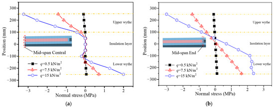 Due to the close relationship between the load-bearing mode of concrete sandwich panels and the structural response, as the load level increases, the cracked damage zone of the sandwich roof structure expands continuously, and the stress distribution pattern of the concrete sandwich panels also changes. Figure 18 presents the distribution of normal stresses at the key points of the mid-span section in the steel–concrete composite sandwich roof structure under elastic load (q = 0.5 kN/m2), cracking load (qcr = 7.5 kN/m2), and ultimate load (qu = 15 kN/m2) conditions. A detailed analysis of Figure 18a reveals that the distribution of normal stresses along the height of the mid-span section is closely related to the magnitude of the roof load. The normal stresses are linearly distributed under the elastic load, indicating a fully composite action state in the sandwich panel. However, as the load increases to the cracking load and ultimate load, the stress distribution along the cross-section becomes irregular. Both the upper and lower wythes experience a compression–bending stress state. However, it is observed that the simplified axial force in the upper wythe has shifted to the sandwich core region, resulting in a non-uniform compressive stress distribution across the entire cross-section. In contrast, the simplified axial force in the lower wythe remains in the lower wythe region, causing a combination of small compressive stresses and significant tensile stresses in the lower wythe. Hence, the sandwich panel exhibits a partially composite action state. An analysis of Figure 18b reveals that the normal stresses at the ends of the mid-span section exhibit a linear distribution under the elastic load and the cracking load. However, as the roof load increases to the ultimate load, the tensile stress in the concrete of the lower wythe reaches a limit of 2.39 MPa, causing it to crack and cease to carry the load. As a result, the neutral axis of the cross-section moves upwards owing to the bending effect.