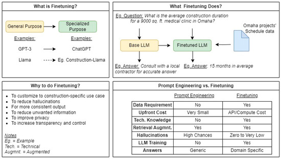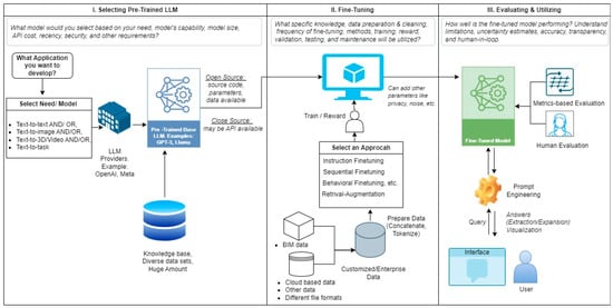 - Fine-Tuning LLMs: The recommended initial approach for the integration of GenAI into the construction industry involves the fine-tuning of available powerful pre-trained language models using construction-specific data. Construction companies have the opportunity to curate datasets comprising various resources such as design documents, building codes, contractual documents, technical documents, and BIM data. These data are helpful in informing the selected LLM about specialized vocabulary and contextual nuances of the construction. Starting with modest datasets and focusing on strongly defined tasks can simplify the process of prompt engineering that enables the GenAI systems for construction needs.