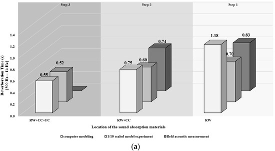 A D50 of >50% is required for speech intelligibility at all frequencies [46,47,48]. Table 7 shows that the measured values of D50 are greater than 50%. The D50 for the field measurement was higher than for the other experimental methods. The D50 standard was met at the RW in step 1. The D50 standard was also met in step 3 at the RW + CC. The field measurement results were not available in step 3, but the other two experimental methods indicated that the RW + CC + FC produced a D50 of ~70%, which would ensure a high level of speech intelligibility.