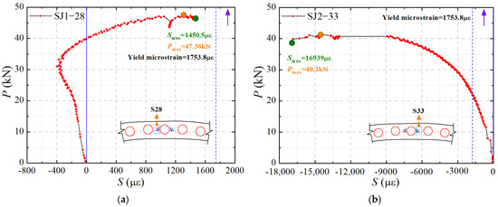 As shown in Figure 12a, the strain of SJ1-28 increases linearly with the increase in load at the initial stage of loading, and the direction is negative. When loaded to about 30 kN, the strain gradually decreases. When loaded to about 40 kN, the strain changes from negative to positive, indicating that the part around the hole in the middle of the web shifts from compression to tension. When the load reached 45.63 kN, the specimen suddenly experienced out-of-plane instability, preventing further application of the load, and thus concluding the loading process. The maximum strain of SJ1-28 was 1450.5 με, which is less than the yield strain of the steel. The curves of SJ1-28 and SJ3-53 are similar and no longer repetitive. Strain SJ2-33 is located to the right of the mid-span hole in the web at the L/2 span. When loaded to 20 kN, the strain started to increase rapidly. When the load reaches approximately 41.20 kN, it cannot continue to increase due to out-of-plane instability of the specimen (see Figure 12b). The maximum strain of SJ2-33 was −16,939 με, which exceeded the yield value of the steel (1753.8 με according to the results of the material test), indicating that SJ2-33 yielded during the test. Similarly, the curves of SJ1-28 and SJ3-53 are alike and not repeated.
