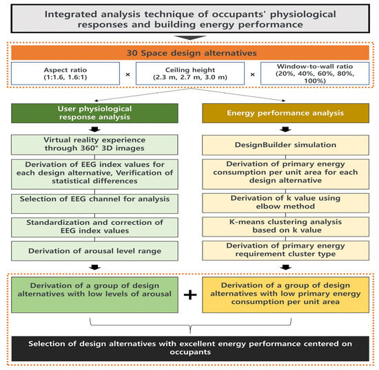 This study replicated a single module space (a single-occupancy postpartum care room) in VR. We analyzed the EEG responses of participants who experienced this space, in addition to evaluating the energy performance of this space using DesignBuilder. A single-occupancy postpartum care room is a space used by mothers to restore their physical and mental health; it is a representative space that requires a comfortable space design that can induce psychological and physiological stability. Additionally, in medical facilities, modular spaces occupy a considerable portion of the entire building, so a design with good energy performance is necessary. Based on our analysis, we set a range that satisfies both the energy performance of the building and the emotional responses of occupants and then selected design alternatives that excel in energy performance while also focusing on the physiological responses of occupants within this range. The study is divided into three major stages, as shown in Figure 1.