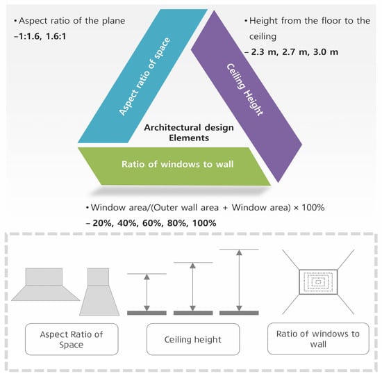 The architectural design elements applied in the VR stimuli for measuring the physiological responses of participants and in the simulation for energy performance analysis are the aspect ratio, ceiling height, and window-to-wall ratio. These elements influence energy performance and the psychological and physiological responses of building occupants [6,9,17,36,37,38,39,40]. These elements can be considered fixed architectural design elements related to energy performance design. Prior to the main experiment, preliminary experiments were conducted using 72 design alternatives with three distinct aspect ratios (1:1, 1:1.6, and 1.6:1), four ceiling heights (2.3, 2.5, 2.7, and 2.9 m), and six window-to-wall ratios (0, 20, 40, 60, 80, and 100%). However, as the experiment duration increased, fatigue and drowsiness occurred. The specific types of architectural design elements selected for this study are shown in Figure 2.