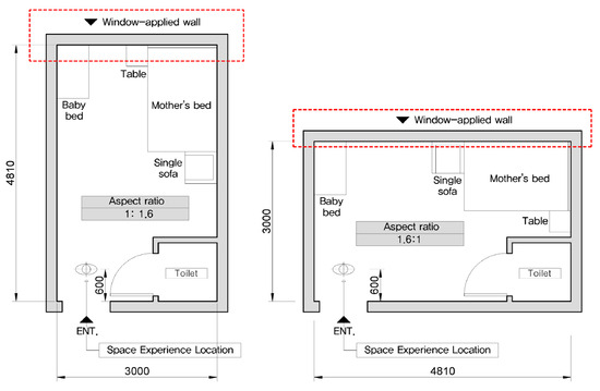 The first element, aspect ratio, refers to the ratio of the width to the length of the floor plan in a single-occupancy postnatal care room. Understanding how a specific aspect ratio can influence occupants could serve as a useful reference for architects designing similar modular spaces under similar area conditions. Differences in energy performance have been identified based on the building shape and aspect ratio [5]. In this study, two aspect ratios—1:1.6 and 1.6:1—were set. The 1:1.6 ratio creates a room that appears to have more depth when viewed from the door of the single-occupancy room, while the 1.6:1 ratio creates a room that appears to be wider. The second element, ceiling height, refers to the distance from the finished floor to the finished ceiling. Ceiling height is one of the key factors for evaluating indoor environmental quality; variations in height serve as indicators of feelings of oppression or spaciousness in human psychology [41]. For the ceiling height element, three values—2.3, 2.7, and 3.0 m—were set. The third element, the window-to-wall ratio, was calculated using the following formula: Window Area (Wall Area + Window Area) × 100%. In this study, the following five window-to-wall ratios were set: 20, 40, 60, 80, and 100%.