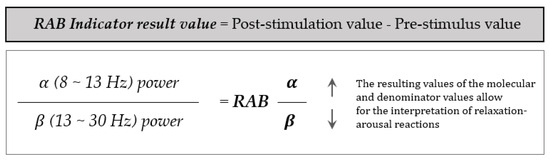Among the various physiological reactions that can be measured using EEG, we focused on analyzing arousal responses, as they are crucial from the perspectives of mental stability and stress [43,45,46,47]. Based on the idea that changes in architectural design elements can induce arousal states in VR experiment participants [31,38], this study utilized the RAB metric to identify arousal responses. The RAB metric represents the relative ratio of the energy of alpha waves, which signify a stable state, to the energy of beta waves, which indicate an excited or aroused state. The RAB metric has been proven to distinguish arousal states [48,49]. Yi & Siti [49] verified that as stress increases, the ratio of alpha and beta waves shows a negative correlation and that the ratio of alpha and beta waves can distinguish EEG data characteristics for stress evaluation. Emanuel et al. [50] verified the correlation between individual cognitive performance and the thermal environment by measuring the changes in EEG signal amplitude (alpha and beta, alpha/beta) under uncomfortable environmental conditions related to the thermal environment. Sosiedka et al. [51] analyzed changes in the alpha/beta ratio in the emotional activation effect of olfactory stimulation, demonstrating that there are distinctive subjective emotional evaluations and brain patterns. Benjamin et al. [48] analyzed visual, auditory, and visual perception. In a memory retrieval task, they found that the alpha/beta ratio decreased as the stimulation of specific information increased. Weinstein et al. [52] stated that the relative increase in the beta to alpha ratio is reflected by increased arousal levels; additionally, Ramirez & Vamvakousis [53] stated that the beta/alpha ratio could be a reasonable indicator of individual arousal. The final RAB metric value used in this study is the value obtained by subtracting the pre-experience background RAB metric from the RAB metric measured after the VR experience (Figure 5).