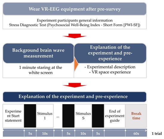 Accordingly, the exposure to visual stimulus was set to 10 s, and the exposure to the black screen to minimize the effect between stimuli was set to 5 s. The experimental environment and the overall experimental procedure are shown in Figure 6 and Figure 7, respectively. During the experiment, participants experienced virtual reality by slowly moving their heads left and right as long as muscle movement did not cause interference. This behavior was confirmed in preliminary experiments to considerably improve immersion in space.
