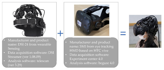 The VR equipment used in the experiment was an eye-tracking head-mounted display (HMD) based on the high-tech computer (HTC) Vive from SMI, and DSI-24, a 24-channel wireless and wired dry EEG measurement device, from Wearable Sensing (Figure 8).