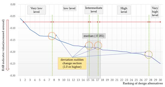 Third, we graphed all the indicator values and applied the above-derived criteria for gaps between deviation rates to distinguish the segments. Both indicators were divided into five segments (Figure 12). A summary of the relative ranges for arousal levels derived in this manner and the criteria based on deviation rates is shown in Table 3. This range was utilized to identify a group of design alternatives among the 30, where arousal levels appeared relatively low, based on the EEG responses of the participants.