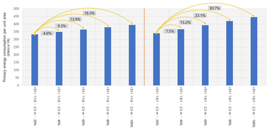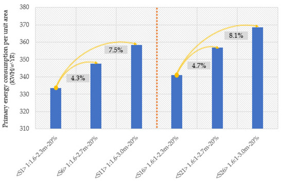To analyze energy performance, we created a single thermal zone model of a typical single-occupancy postnatal care room using DesignBuilder. Based on the shape factors of the model, we sought to analyze the annual primary energy consumption per unit area.