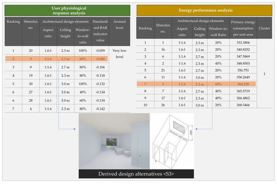 Among the 30 design alternatives created with the combinations of architectural elements, we identified a group of design alternatives that showed relatively low arousal levels based on the EEG responses of participants. We also identified a group of design alternatives with relatively high energy performance based on the K-means clustering analysis of the annual per unit area primary energy consumption. After reviewing the two groups identified in the above-mentioned analysis, we selected the final design alternative that exceled in energy performance, based on the physiological responses of occupants.