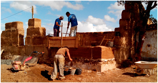 In the case of constructions with defensive military purposes, air lime and sometimes other additions were added to the earth. This mixture with the earth was made before placing it inside the formwork in layers for compaction, taking on the designation of “military” rammed earth (Figure 3).