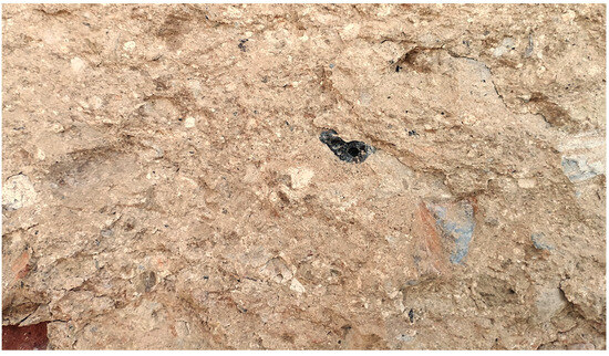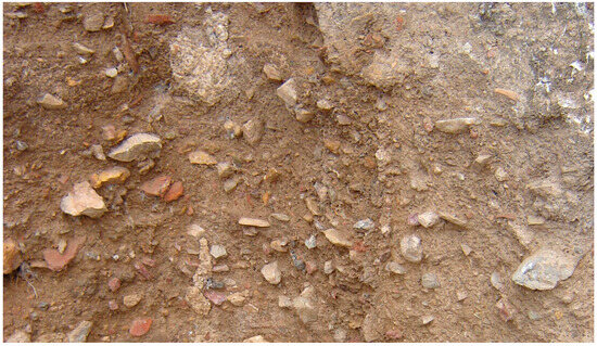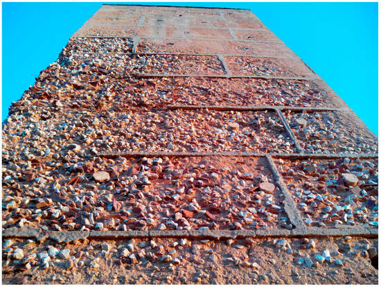 Concerning the production of the military rammed earth, in addition to quick lime, other additions to the earth were carried out where it was made, such as the addition of crushed red ceramic waste (from bricks and tiles) and medium-sized stones (Figure 5). Nevertheless, the intentionality of adding these materials is uncertain. Because they were military defensive structures, these buildings required fast construction and fast reconstruction. For that purpose, the collection of building materials was always conducted nearby, and the available supplies could easily include debris from former constructions destroyed by war.