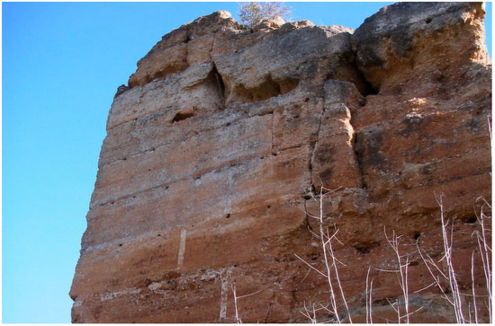 In terms of building preservation, it is interesting to study which factors affect the resistance and durability of this type of structure, especially in the face of threats that are considered more aggressive for earthen constructions. Among them, the action of water, such as heavy and prolonged rain or the capillary rise of water from the ground soil, stands out [25]. Water infiltration and the presence of cracks and fractures enhance the presence of vegetation, which greatly accelerates the degradation of walls and other rammed-earth structures.