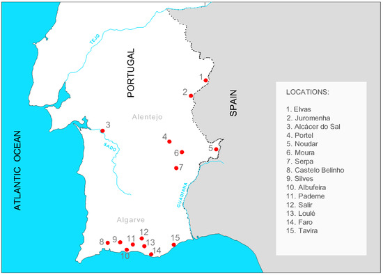 Location of some of the most significant rammed-earth defensive military structures in the south of Portuguese territory (Alentejo and Algarve regions, southwest on the map in Figure 7).
