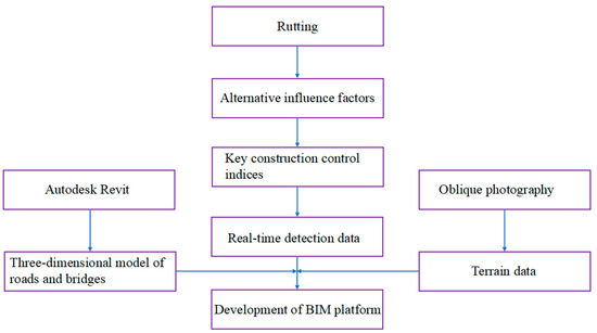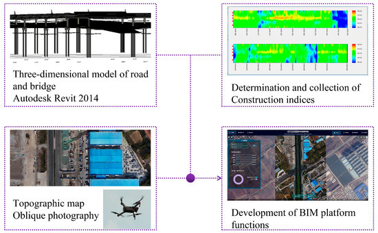 The BIM system was established by the project team to enable the real-time and intuitive monitoring of the asphalt pavement’s construction quality. The platform consists of four components: 3D model of road and bridge, geographical data, tracking data, and system attributes. Among them, 3D models can display the construction information associated with roads and bridges. Topographic data can be used to obtain accurate and clear topographic maps. Construction monitoring indicators and construction control data are obtained through experiments and sensors, respectively. The platform’s function is to analyze and display construction information. Figure 7 illustrates the process of constructing the BIM framework.