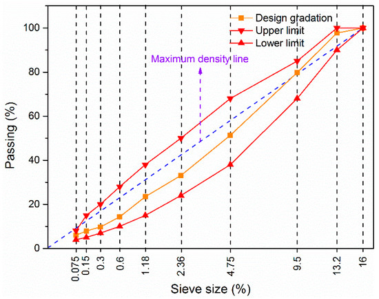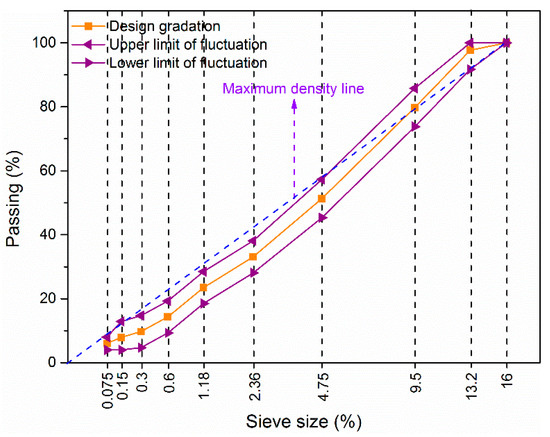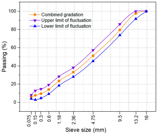 According to the aforementioned analysis, the size distribution, asphalt binder content, rolling thermal level, number of passes during compaction, and layer depth all play a role in the high-temperature performance. The number of compaction repetitions can be precisely managed with GPS-RTK technology [30]. Consequently, the gradation, the asphalt proportion, and the rolling temperature were the primary considered factors evaluated in this study for rutting resistance. Figure 3 shows the permissible variation range of the size distribution in the asphalt mixing plant [6]. The maximum amount of variation in asphalt binder content that can be tolerated with ±0.3% [6]. The temperature for molding (or rolling) was kept within a design variation range of 15 °C. The appraisals of how these variances influence the high-temperature actions of asphalt mixtures were then evaluated.