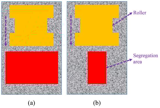 The problems of segregation of gradation and temperature often occur in asphalt mixtures. Previous studies have shown that these two segregation problems reduce the performance of asphalt mixtures [31,32,33,34,35]. Most studies mainly model large areas of isolation. As shown in Figure 4a, the width of the segregation zone approaches or exceeds the rolling width of the roll. Large-area segregation, on the other hand, is uncommon during the regular building of an asphalt layer. In addition, the capability of the asphalt blend in the dissociated area is uncertain when the segregation region’s magnitude is smaller than the compactor’s flattening width, as exhibited in Figure 4b. Hence, this study chiefly concentrates on examining the effectiveness of limited-area segregation.