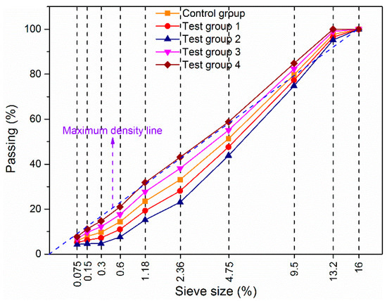 When assessing the influence of grading fluctuation on asphalt concrete’s behavior, it is impractical to accurately attain the intended gradation employing four aggregate sizes. As a result, aggregates of various sizes were sieved into closer size fractions of 0 to 75 μm, 75~150 μm, 150~300 μm, 300~600 μm, 600~1180 μm, 1180~2360 μm, 2360~4750 μm, 4750~9500 μm, 9500~13200 μm, and 13,200~16,000 μm and stored separately. These sieved aggregates were then used to make the asphalt mixture. The asphalt mixtures were created using the sieved aggregates, and the porosity was measured, as shown in Table 5.