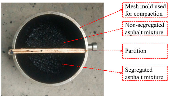 To measure the void content of segregated zone, the Superpave compaction technique was applied. This study examined the impact of the non-segregation zone on the segregation zone. Figure 6 depicts the mesh mold. Before forming samples, first, it is necessary to measure the weight of both homogeneous and heterogeneous asphalt blends. The Superpave Gyratory Compactor’s records showed a correlation between the specimen’s height (or air spaces) and the gyrations number. The asphalt mixtures’ air voids after paving were about 10% [37] for the road construction project. To reach 10 percent and 3.7 percent air voids, the gyration number needed was 11 and 63, respectively. The height of the specimen for segregated zone with 11 gyrations should be equal to that of the non-segregated zone since both had the same thickness after paving. This is the basis for determining the mass of the segregated specimen. Following that, a preset mass of non-segregated and segregated asphalt pavements was deposited on opposite sides of the barrier. The molds for making specimens were designated to correspond to the partition’s position. When the asphalt mixture reaches the predetermined forming temperature, the separator can be removed and placed in the Superpave gyratory compactor for forming. The screen is removed after 63 revolutions. The sample was divided into two parts based on the marking. The cut specimens’ air voids were determined following T 0705−2011 [28], and Table 9 shows the results. The research specified a 1:1 ratio between the area of segregation and the area without segregation. By altering the width and position of the divider, different ratios can be achieved.