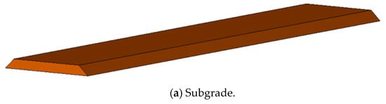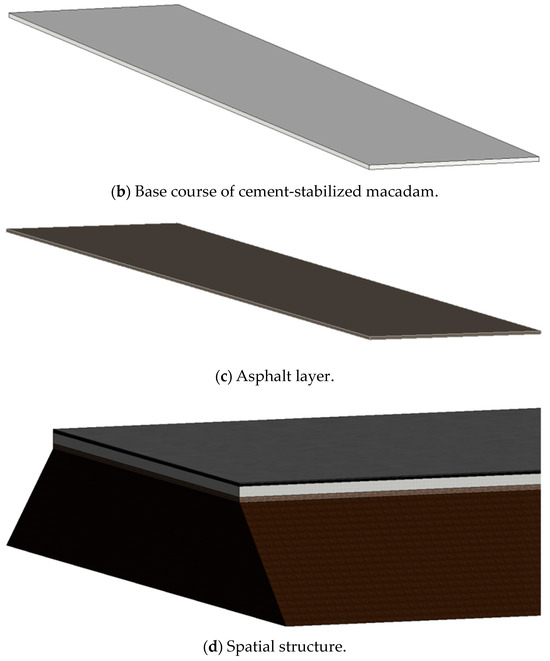 The 3D models were created including subgrade, base course of cement-stabilized macadam, and the surface of asphalt layer in Autodesk Revit 2016 software, and the pavement structure was integrated into the BIM platform. The division of components is based on the paving distance and position of a truck of mixture. The origin of the module is the preliminary paving site of asphalt combination on a lorry. Figure 8 depicts the BIM models for asphalt pavement and subgrade.