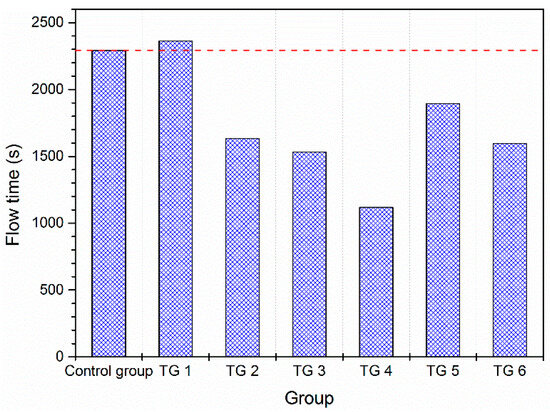 As depicted in Figure 12, when the asphalt concrete’s gradation grows coarser as a result of segregation, the flow time of the asphalt concrete at first undergoes a minor increase followed by a decrease. This is due to the fact that as the ratio of coarse aggregates increases, the aggregate’s role as a skeletal framework is reinforced. But if the fraction of coarse aggregates exceeds a specific boundary, the asphalt mortar percentage decreases and the bonding capability of the asphalt mixture declines. Conversely, when the size distribution turns finer due to segregation, there is a reduction in the asphalt mixtures’ flow time. This is due to the declining fraction of coarse aggregates and rising proportion of asphalt mortar. The skeleton function of the aggregates will be rapidly weakened. In addition, when temperature segregation occurs, the rolling temperature decreases. The asphalt layer’s compaction degree is reduced, and the skeleton function of the aggregates is significantly affected.