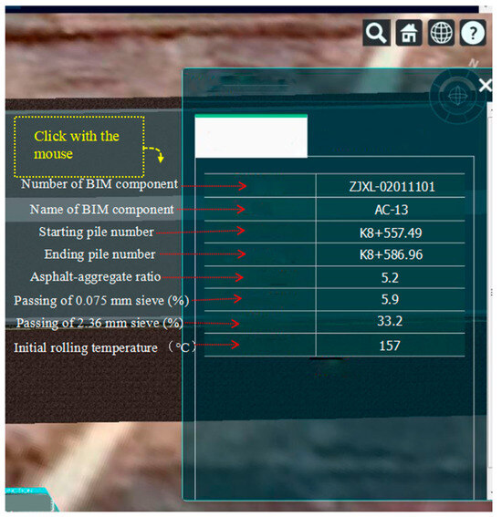 The obtained or forecasted construction data are promptly uploaded to the BIM platform. These data are associated with the BIM components of the highway. Then, the construction personnel can sign into the platform network to visualize the construction information and observe the values of construction parameters at all places and times. Figure 15 presents the gradation, asphalt binder content, and the initial rolling temperature associated with a BIM component. Moreover, the construction information can also be analyzed centrally. Every participant involved in the asphalt pavement’s construction can access the BIM system to check the construction details. The login personnel can directly locate the asphalt pavement from the construction information. When the values of the construction indicators exceed the warning range, construction should be suspended and remedial measures should be taken. This can reduce the rework and the waste of asphalt mixtures.