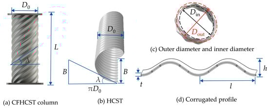 Concrete-filled steel tube (CFST) columns have been widely used as the load-bearing members of high-rise and super high-rise buildings [1], long-span bridges [2], industrial plant columns [3], and subway platform columns [4] in recent years. The use of CFST columns has been proven to be an effective method for improving structural properties, such as strength and stiffness [5,6]. However, due to various factors, such as changes in a structure’s use, changes in the environment, damage or degradation of the existing structure, seismic loads, etc., CFST columns often require improvements to address their low ductility, local buckling, and corrosion resistance. Concrete-filled corrugated steel tubular (CFCST) composite columns are considered to be an effective solution [7,8].