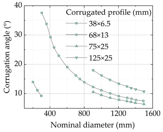 At present, the GB/T 34567-2017 Cold-Formed Corrugated Steel Pipe [27] specifies the specifications and dimensions of the HCST, and the diameter and helix angle of the steel tube corresponding to the recommended HCST specification are shown in Figure 2.
