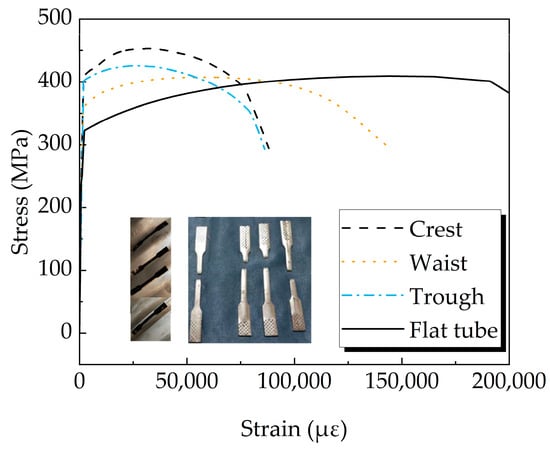 Three dog-bone coupons were taken from the crest, trough, waist, and lock seam of the HCST and examined using an electronic universal testing device. The coupons were prepared and tested according to the specifications outlined in GB/T 228-2010 [28]. Figure 4 shows the stress–strain curves and failure modes of the dog-bone specimens. In the elastoplastic stress analysis, the influence of the yield strength at different positions on the HCST was considered. The yield strength of the HCST is shown in Table 2.