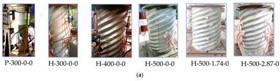 In a recent paper, Liu et al. [7] investigated the axial compressive behaviors of ACST columns filled with concrete. However, it is important to conduct additional experimental research on concrete-filled HCSTs, since the manufacturing processes for HCSTs and ACSTs differ significantly from each other. Moreover, practical engineering applications will involve larger-diameter, concrete-filled HCST composite columns with appropriate longitudinal reinforcement. Due to the helical angle of HCSTs, larger diameter columns may exhibit distinct failure modes and load transmission processes compared to smaller diameter columns. However, existing research on the axial compression of concrete-filled HCSTs does not consider the fact that the helical angle decreases as the column diameter increases [8,17,23,24].